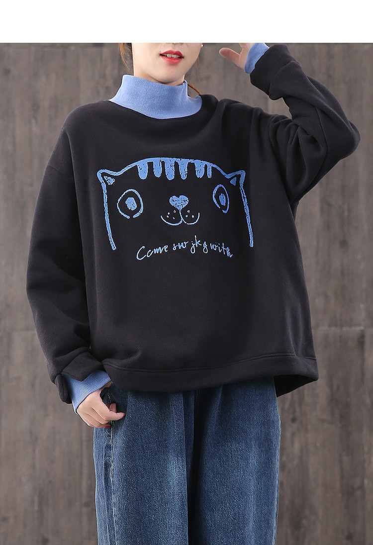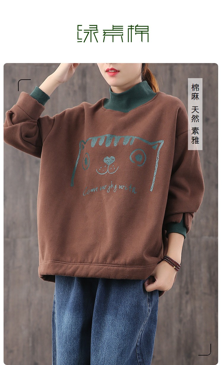 【绿素棉】2020秋冬 宽松休闲加绒大码 卡通高领卫衣女慵懒风上衣
